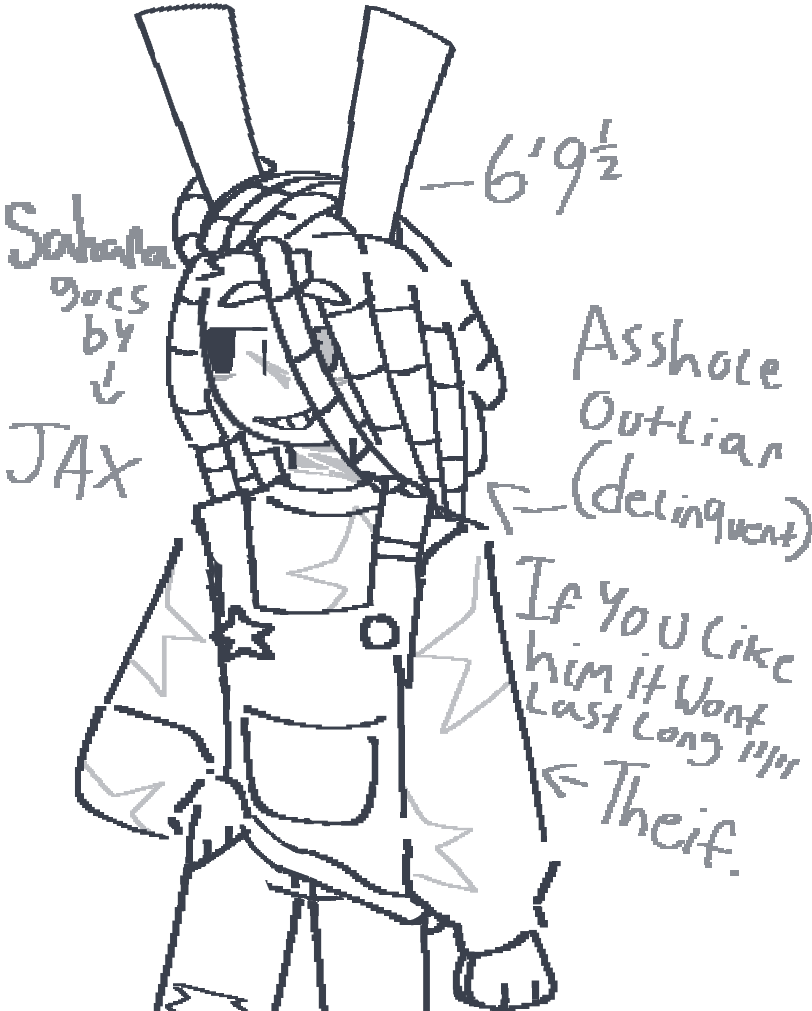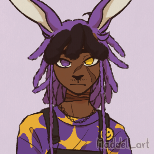 A lanky dark-skinned lilac rabbit with a monotone voice and antagonistic tendencies who has an outwardly mischeivious and self-satisfied nature. Talk of the town (Frosting) as a known theif and an outcast. The scapegoat for a lot of unclosed personal damage cases.